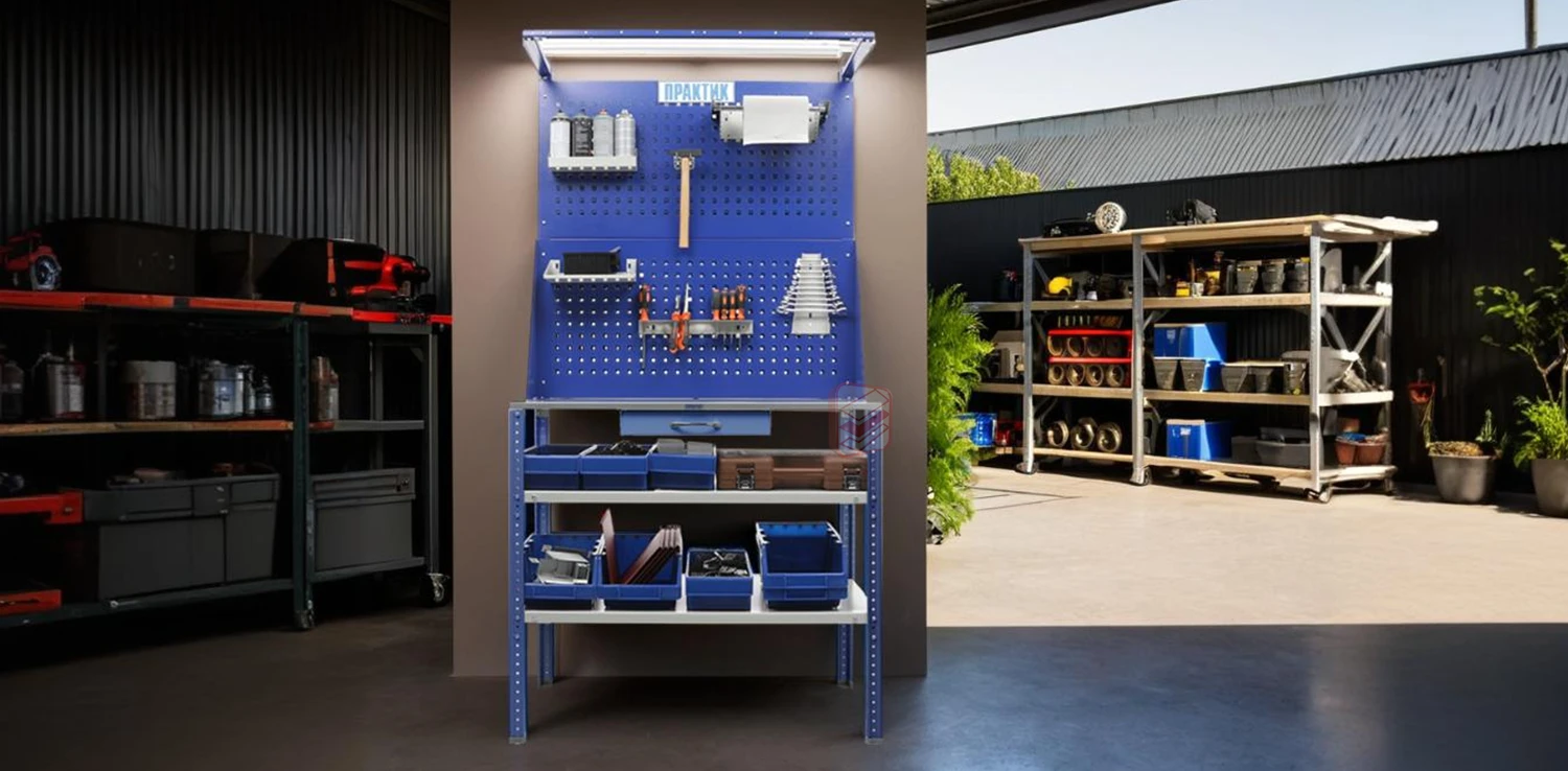 ✔ Дополнительные функции – встроенные тиски, розетки, освещение, выдвижные ящики.